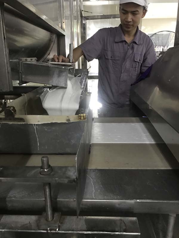 布好漿的網(wǎng)帶自動(dòng)進(jìn)入蒸粉機,將米漿蒸熟成米粉片;